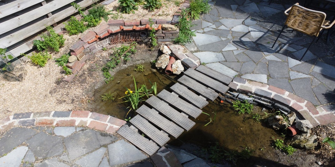 Dit is een tuin die stap voor stap aangelegd wordt en waar ecologie en duurzaamheid de uitgangspunten mogen zijn. Tot nu toe zijn er halfverharde paden, een stapelmuurtje en een wadi aangelegd in de achtertuin. In de voortuin heeft Maartje van De Kleine Wildernis een border aangelegd. Er is niet veel regen nodig om deze wadi tot zijn overloop te vullen met water, waardoor je regenbuien op een heel andere maniergaat ervaren. Het is spannend om te zien hoe het waterpeil fluctueert naar mate het een periode meer of minder regent. Het water trekt allerlei soorten leven aan.