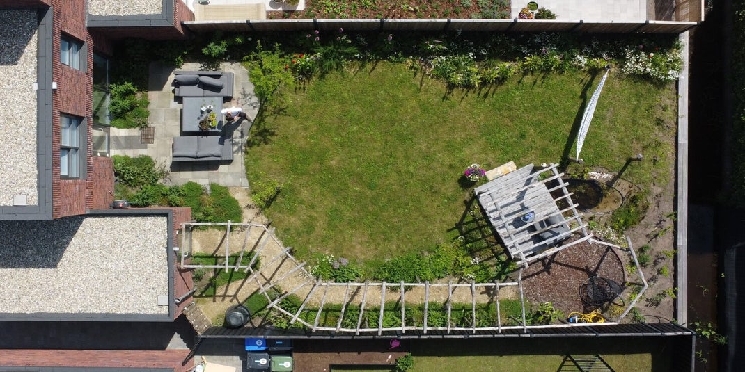 Zoveel mogelijk groen is wederom de opdracht geweest voor deze tuin, naast een manier om meer beschut te zitten. De tuin is omringd door hoogbouw waardoor je je erg bekeken kan voelen als je buiten bent. Dit is opgelost door een flinke pergola midden in de tuin te plaatsen. Deze zal op termijn volgroeiën met klimplanten, waardoor er schaduw en beschutting in de tuin ontstaat. De rest van de tuin is bijna helemaal opengehouden voor planten. Met uitzondering van een klein terras en een paar stoeptegels als staptegels. De ruimte daaromheen is ingezaaid met een inheems kruidenmengsel. Het stapelmuurtje kan dienen als zitplaats en is samen met de pergola een element dat er voor zorgt dat er ook in de winter iets is om naar te kijken in de tuin. De laatste twee foto's zijn gemaakt voordat de planten op hun plek zijn gezet.