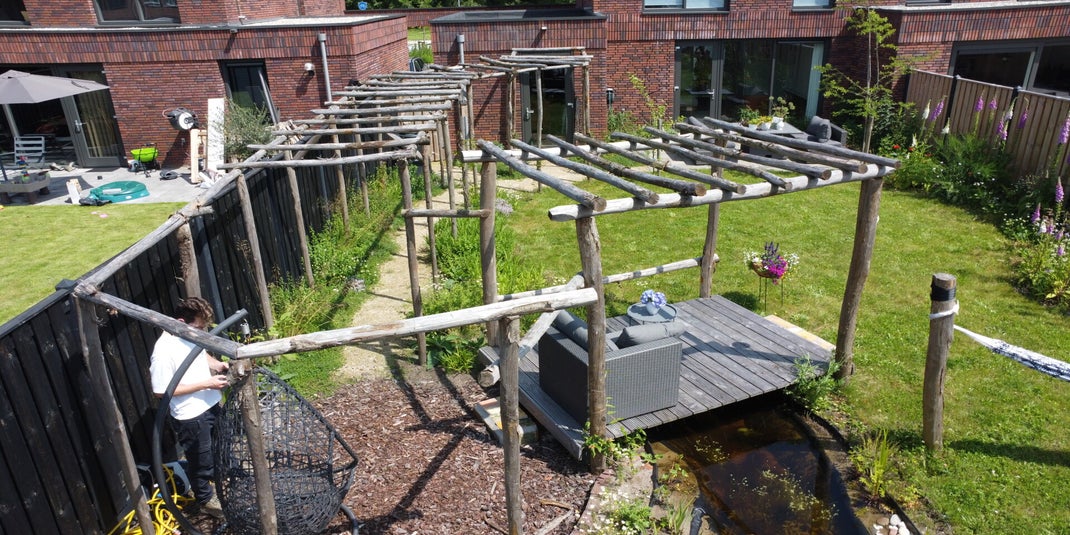 "Golvende lijnen" zei de ene klant, "maar niet te rommelig" was de wens van de wederhelft. Het bleek een uitdaging om een tuin te maken die bij de strakke architectuur van een nieuwbouwwoning past. Door de golvende lijnen geometisch te maken combineerden ze goed met rechte lijnen waardoor de tuin zowel een natuurlijk als een geordend gevoel kreeg. Het terras is gemaakt van hergebruikte maar niet te erg verschillende tegels. De paden van halfverharding lopen onder een lange kastanjehouten pergola naar het terras met vlonder achter in de tuin. Op deze plek in de tuin staat 's ochtends de eerste zon. De vlonder met de tweede pergola ligt over de vijver, zo kan je vlakbij het water zitten. Deze foto's zijn tijdens de aanleg en vlak na de oplevering gemaakt.